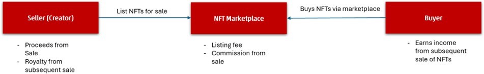 paid in the form of cryptos such as Ethereum. Off marketplace transactions, i.e., direct transaction between a buyer and a seller can also happen without involving a marketplace. The seller may list NFTs on its personal or business website. A typical lifecycle for NFT looks like this: